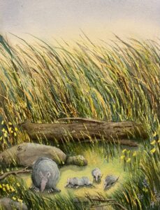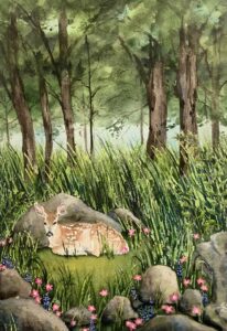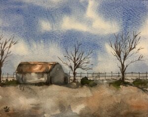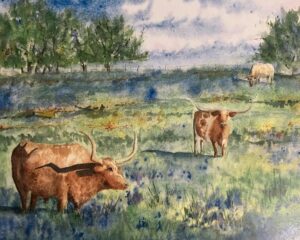 I frequented the old college in Clifton Texas now home to the Bosque Arts Center for different things when I was young. The building was used for my tumbling lessons, and plays, and it was always fun to sneak around looking at the art displayed in all the nooks and crannies. I remember seeing the art of Mr. Grelle and other artists and especially was enamored by the sculptures. My father was a well-known wood carver in the 90’s and I have a special place in my heart for sculptures. My parents collected the art of Otho Stubbs from Turkey Texas, and his art still graces the walls of their home in Meridian Texas. His beautiful paintings in pastel pinks and blues featured cowboys and Indians, and I grew to love Texas’ beauty because of his art. Most of the art I grew up seeing depicted cowboy art and most of my art comes straight from my heart with my country raising and influence. Some day I may delve into other mediums but right now I am enjoying watercolor and its challenges. I can see oil painting and sculpting in my future.